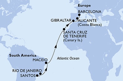 Маршрут круиза: Сантус - Рио-де-Жанейро - море - море - Масейо - море - море - море - море - море - море - Санта-Крус-де-Тенерифе, о. Тенерифе - море - Гибралтар - Аликанте - Барселона