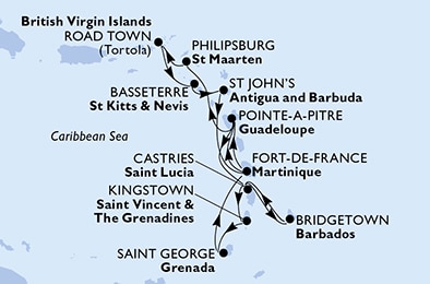 Маршрут круиза: Бриджтаун, о. Барбадос - море - Кингстаун, о. Сент-Винсент - Сент-Джорджес, о. Гренада - Фор-де-Франс, о. Мартиника