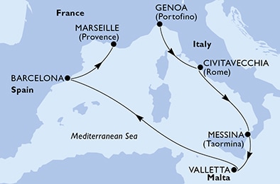 Маршрут круиза: Мессина, о. Сицилия - Валлетта - море - Барселона - Марсель - Генуя / Милан - Чивитавеккья / Рим - Мессина, о. Сицилия