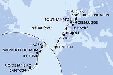 Маршрут круиза: Сантус - Рио-де-Жанейро - море - Ильеус - Сальвадор - Масейо - море - море - море - море - море - море - Фуншал, о. Мадейра - море - Виго