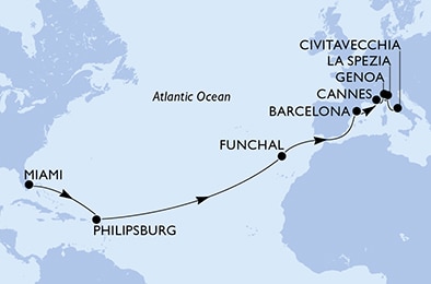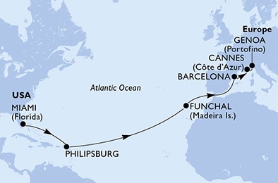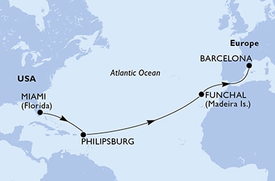 Маршрут круиза: Майами - море - море - Филипсбург, о. Синт-Мартен - море - море - море - море - море - море - Фуншал, о. Мадейра - море - море - Барселона